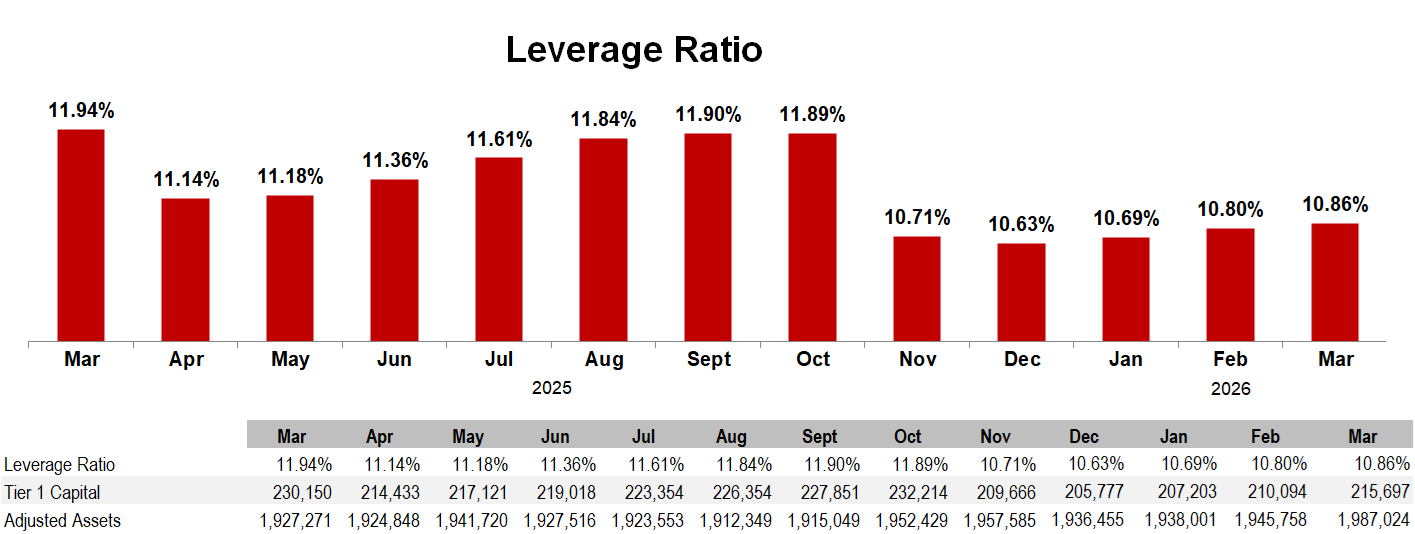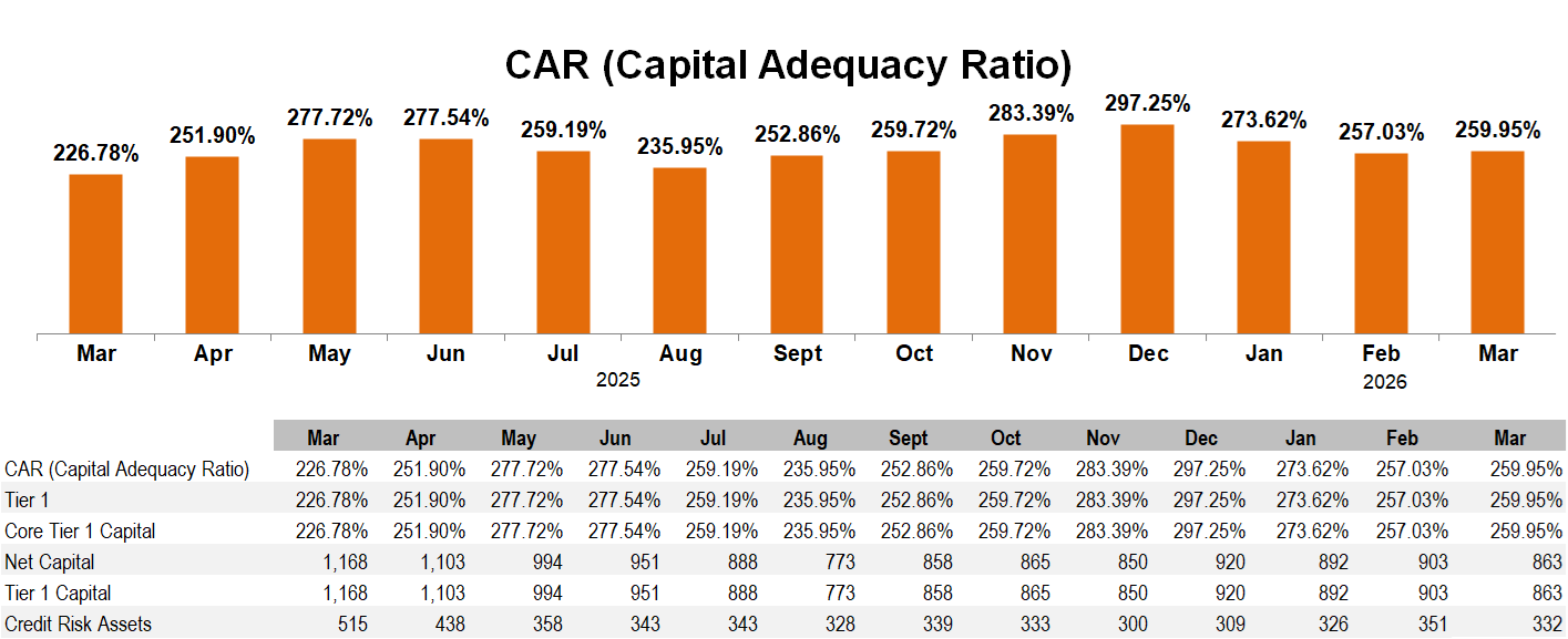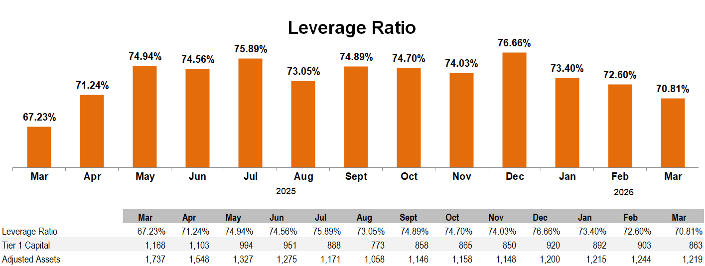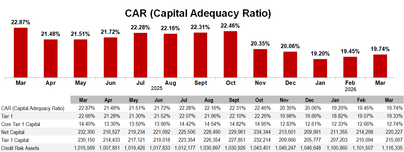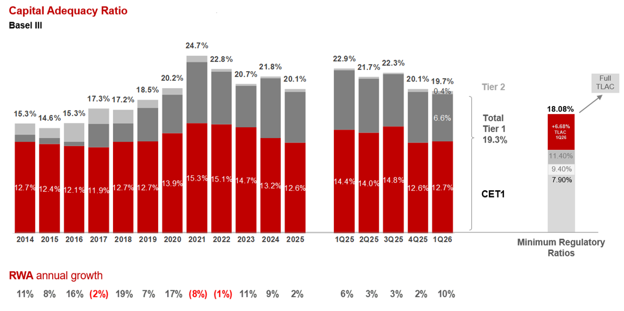 In 2025, Banorte was confirmed as a Level II – Systemically Important Financial Institution, which implies that Banorte must maintain a 0.90 pp capital buffer. Additionally, it must comply with an additional net capital supplement (TLAC), which as of March 2026 amounts to 6.68 pp, in accordance with current regulations. Consequently, as of March 2026, the minimum Capital Adequacy Ratio for Banorte stands at 18.08%. Meanwhile, the minimum Core Equity Tier 1 (CET1) is 7.9%.