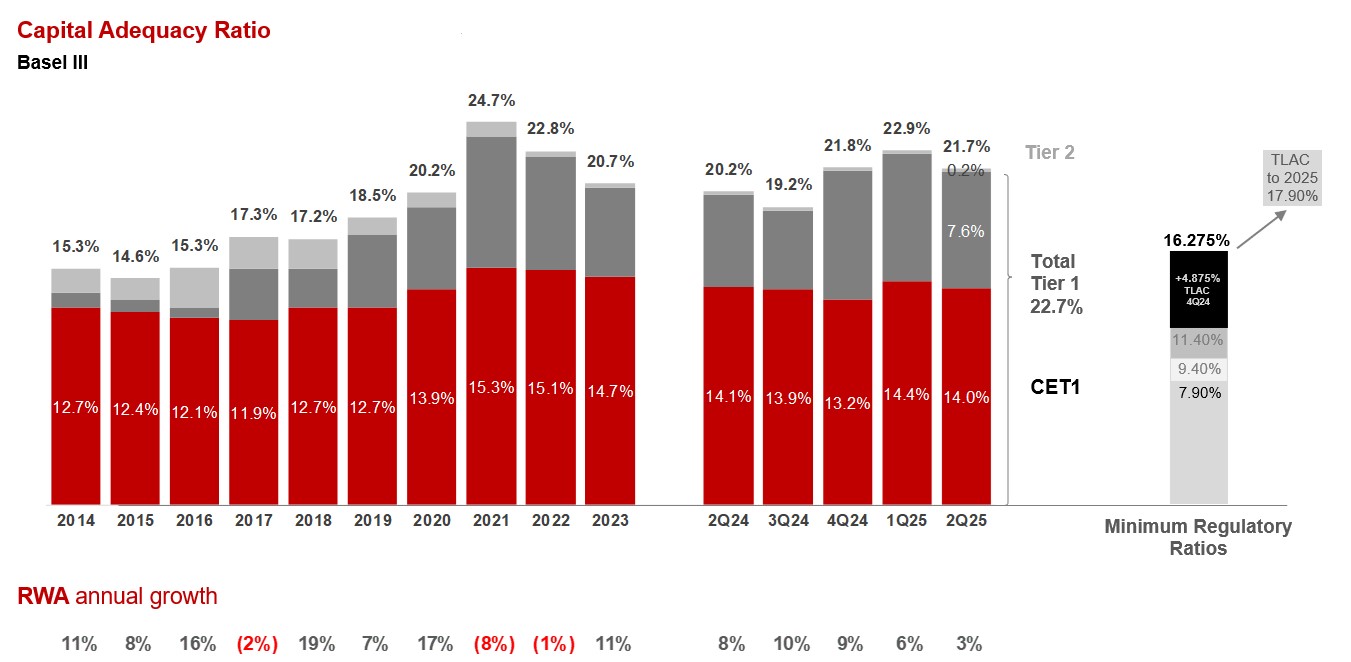 In 2023, Banorte was confirmed as a Level II - Systemically Important Financial Institution, which implies that Banorte must maintain a 0.90 pp capital buffer. Therefore, starting on December 2019, the minimum Capital Adequacy Ratio required for Banorte is 11.40% (corresponding to the regulatory minimum of 10.5% plus the 0.90 pp capital supplement), which includes a minimum requirement of Core Equity Tier 1 (CET1) of 7.90%.