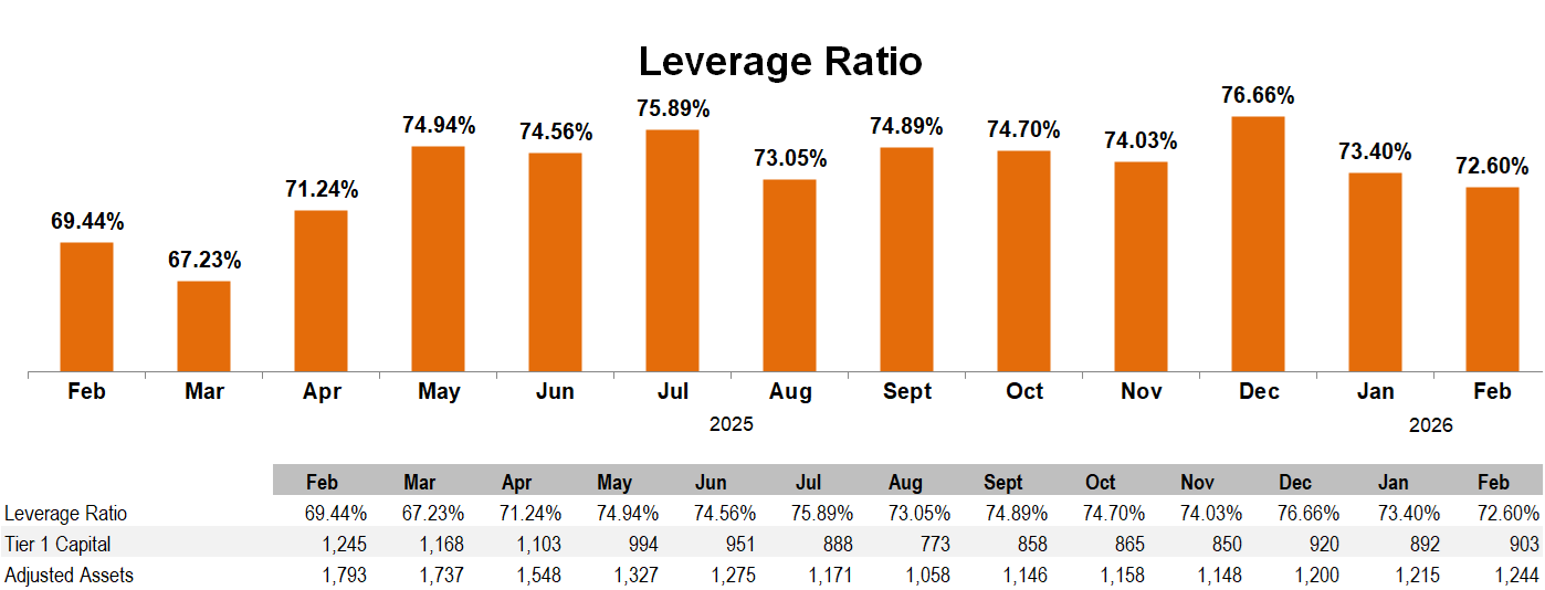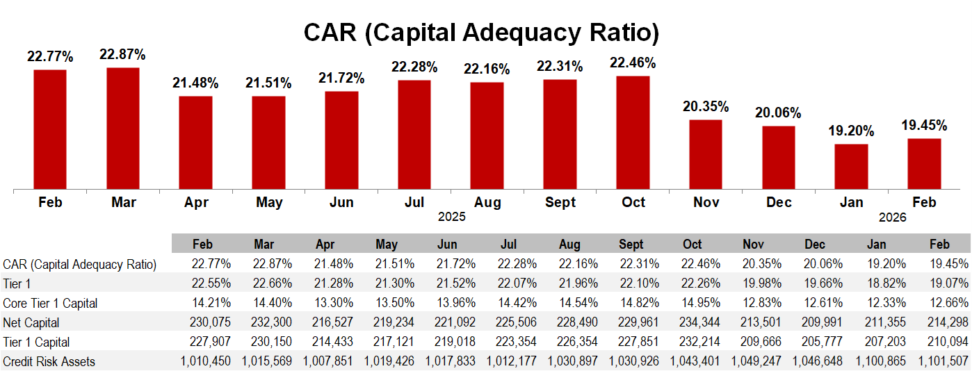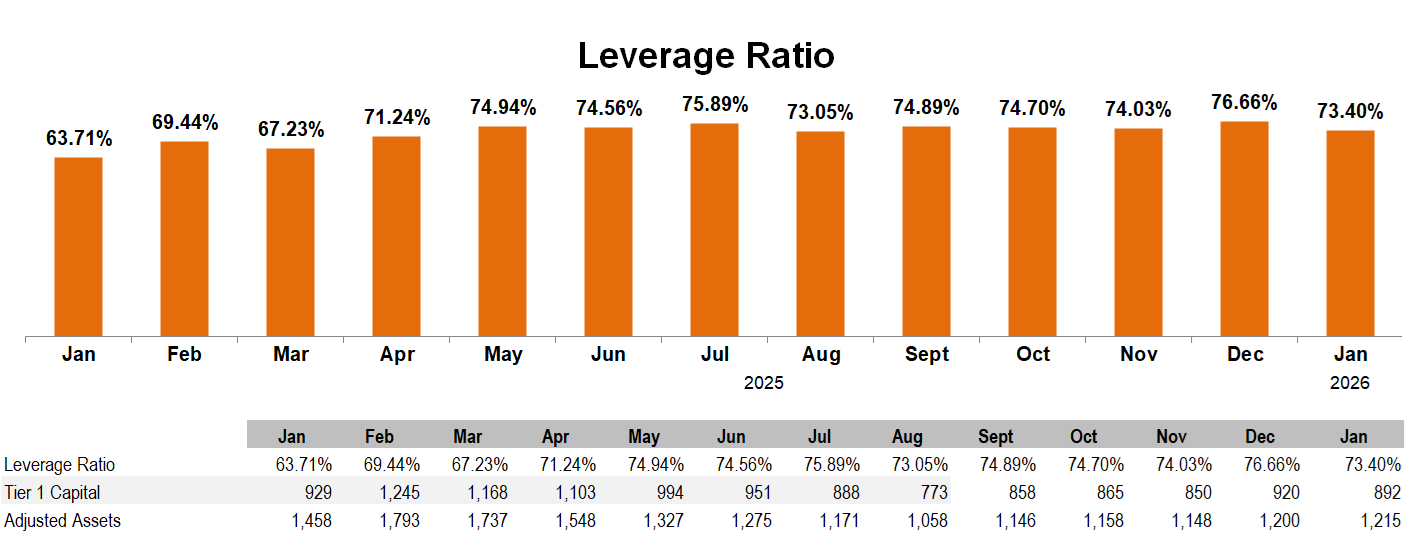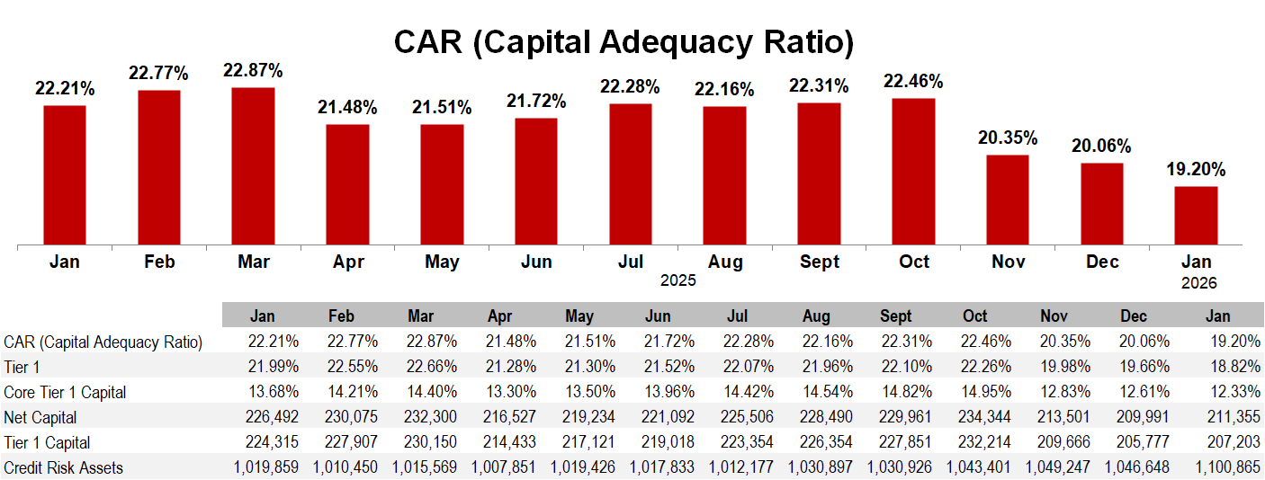In 2025, Banorte was confirmed as a Level II – Systemically Important Financial Institution, which implies that Banorte must maintain a 0.90 pp capital buffer. Additionally, it must comply with an additional net capital supplement (TLAC), which as of the end of 2025 amounts to 6.94 pp, in accordance with current regulations. Consequently, as of December 2025, the minimum Capital Adequacy Ratio for Banorte stands at 18.34%. Meanwhile, the minimum Core Equity Tier 1 (CET1) is 7.9%.