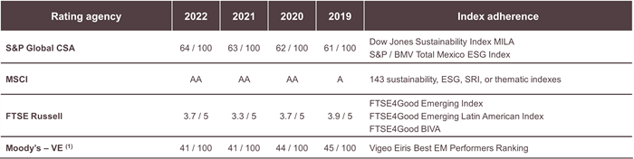 Our performance in Environmental, Social and Governance (ESG) factors is constantly evaluated by different rating agencies and data providers globally to issue ratings and related opinions. We understand that standing out with good results converges in the attraction and retention of institutional investors interested in ESG issues.