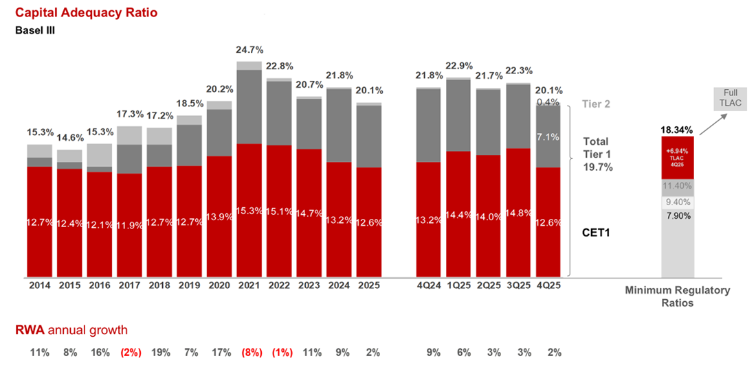 En 2025, Banorte fue confirmado como Institución de Banca Múltiple de Importancia Sistémica Local de Grado II, por lo que debe mantener un suplemento de conservación de capital de 0.90 pp. Adicionalmente, deberá cumplir con un suplemento adicional de capital neto (TLAC), que a cierre de 2025 corresponde a 6.94 pp, de conformidad con la normativa vigente. Con ello, a diciembre 2025 el Índice de Capitalización mínimo requerido para Banorte asciende a 18.34%. Por su parte, el requisito mínimo para el Capital Fundamental (CET1) se ubica en 7.9%.