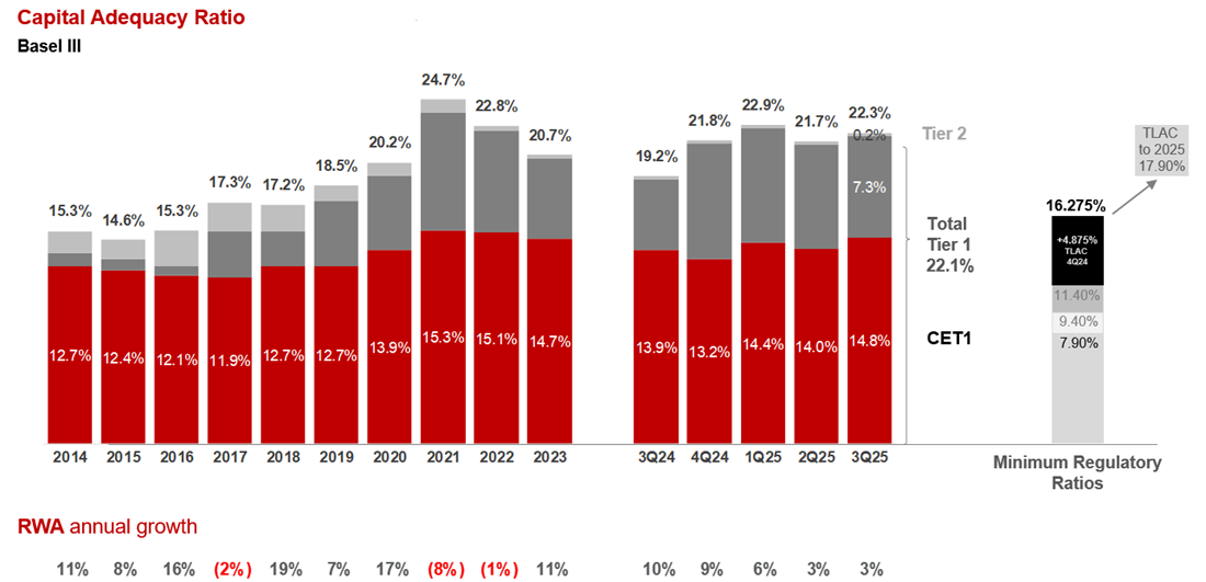En 2023 Banorte fue confirmado como Institución de Banca Múltiple de Importancia Sistémica Local de Grado II por lo que debe mantener un suplemento de conservación de capital de 0.90 pp. Con lo anterior, a partir de 2019 el Índice de Capitalización mínimo requerido para Banorte asciende a 11.40% (correspondiente al mínimo regulatorio del 10.5%, más el suplemento de capital de 0.90 pp); por su parte el mínimo requerido para el CET1 es de 7.90%.